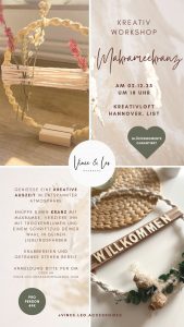 Am 2. Dezember wird’s gemütlich im Kreativ Loft Hannover – denn gemeinsam mit @vince.leo.accessoires laden wir dich zu einem besonderen Abend ein: Beim Makramee-Kranz Workshop darfst du dir deine eigene kleine Auszeit gönnen, kreativ werden und etwas Schönes mit nach Hause nehmen.